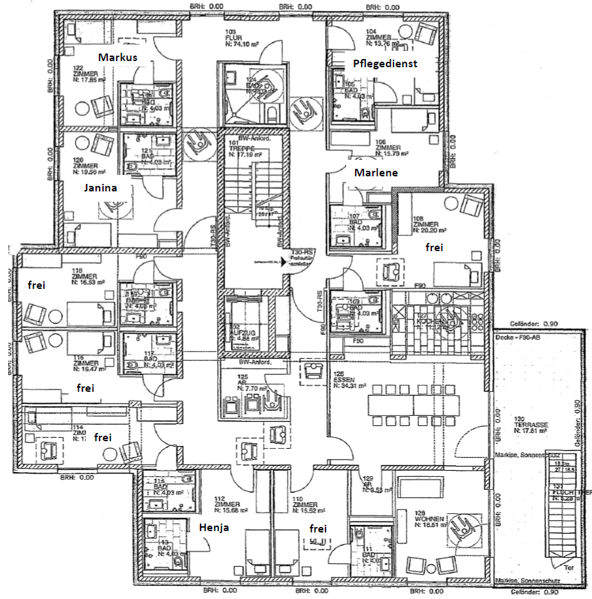 Die Wohngemeinschaft am Kipphut in Sarstedt hat eine ein Fläche von insgesamt 360 m² und ist komplett barrierefrei. Sie umfasst zehn Einzelzimmer mit eigenem Bad. Zusätzlich gibt es eine Wohnküche, einen großen Balkon, ein Wohnzimmer, ein Pflegebad und einen Abstellraum für die Waschmaschine und den Trockner. Die Gemeinschaftsräume haben eine Fläche von insgesamt 96 m². Nachdem in den letzten Monaten zwei Bewohnerinnen ausgezogen sind, sind wir zurzeit zu viert. Ein Zimmer ist an den Pflegedienst vermietet, sodass fünf Zimmer mit einer Fläche zwischen 15 und 20 m² frei sind. Die Warmmiete für ein Zimmer mit 15 m² beträgt ca. 610 € im Monat. Die Kosten können unter bestimmten Voraussetzung im Rahmen der Grundsicherung übernommen werden.